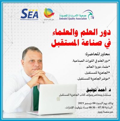 كما اصبح مستشارا لأنظمة الجودة وجودة المعامل ثم سافر إلى الإمارات للعمل مدير للجودة والبيئة والصحة والسلامة المهنية وهناك اكتسب المزيد من الخبرات في مجالات التميز المؤسسي والتميز الحكومي والتطوير المؤسسي والقيادة والتخطيط الاستراتيجي واستشراف المستقبل والابداع والابتكار وإدارة المعرفة وغيرها الكثير من المهارات والخبرات. يهتم احمد توفيق بالثقافة العلمية والدبلوماسية العلمية والادارة العلمية والتطوير المؤسسي.